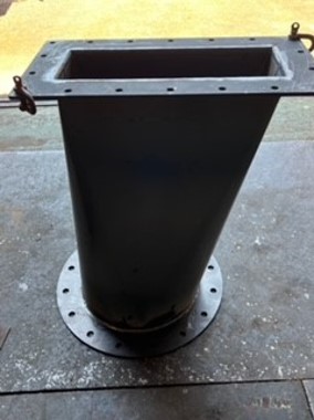 角ダクトと丸ダクトの接続部分が偏心(中心がずれている)形状。